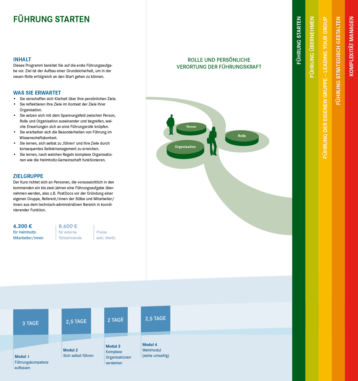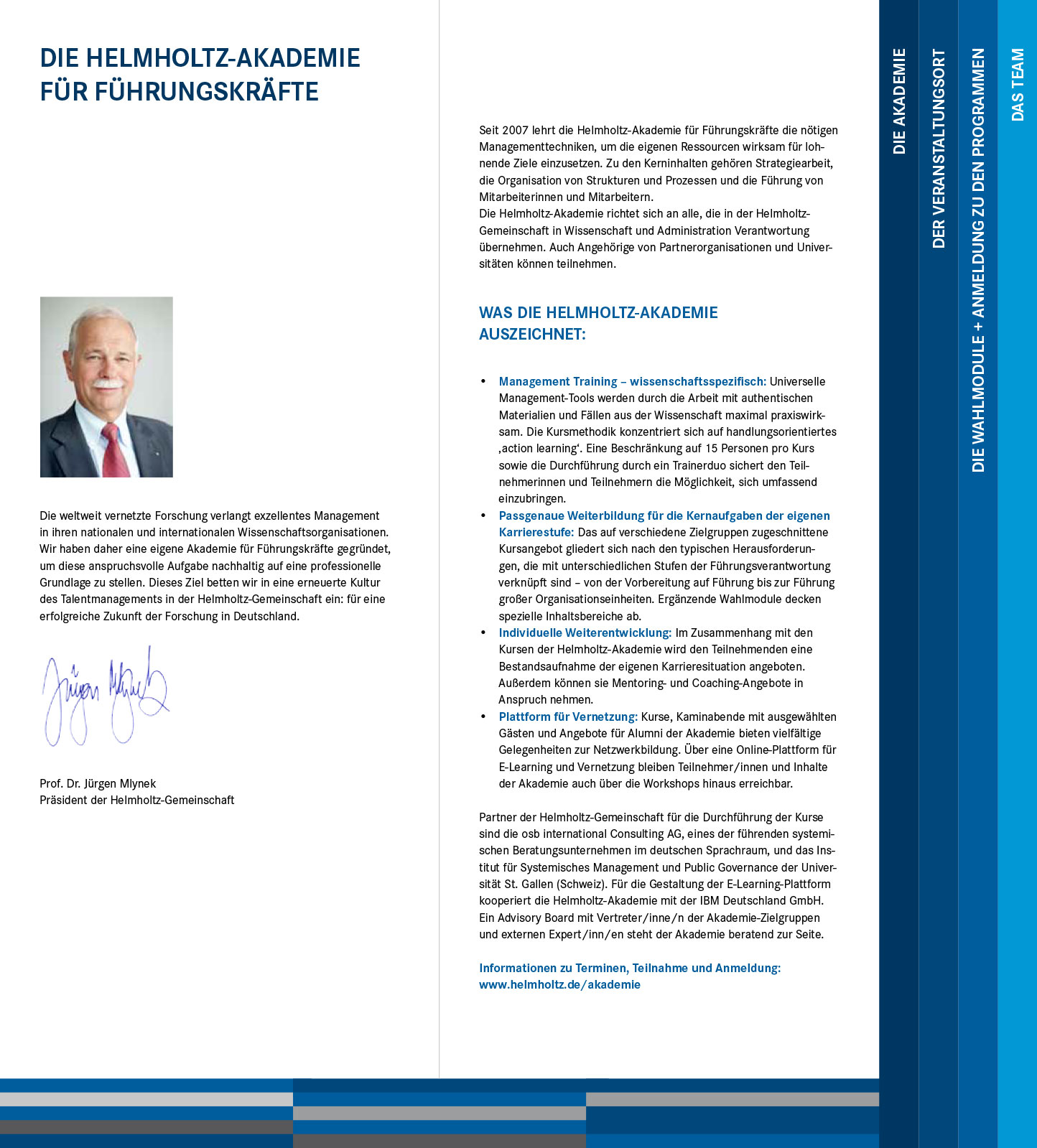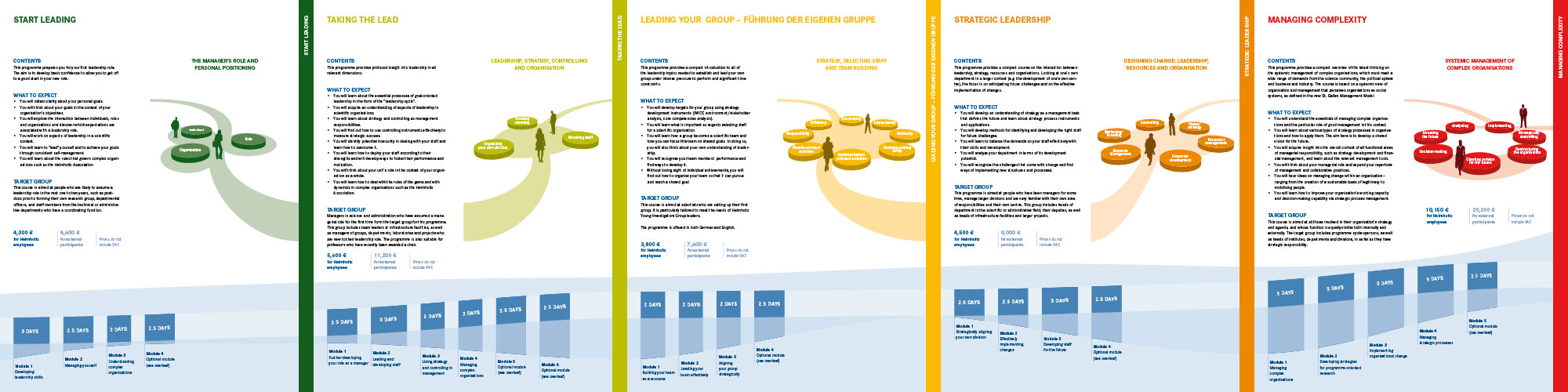 Kreativdirektion, Print-Design und Infografik-Design für Helmholtz · Gestaltung des gedruckten Programms und Curriculums der Helmholtz-Führungskräfteakademie. Das Leporello zeigt den Weg der Führungskräfte durch das vielfältige Kursprogramm in einem sehr weiten, mit einem rafinierten Treppenfalz ausgestatteten Format. Die einzelnen Programmstationen sind am rechten Rand des geschlossenen Leporellos durch die Falzung über eine Art Register jeweils direkt zugänglich.