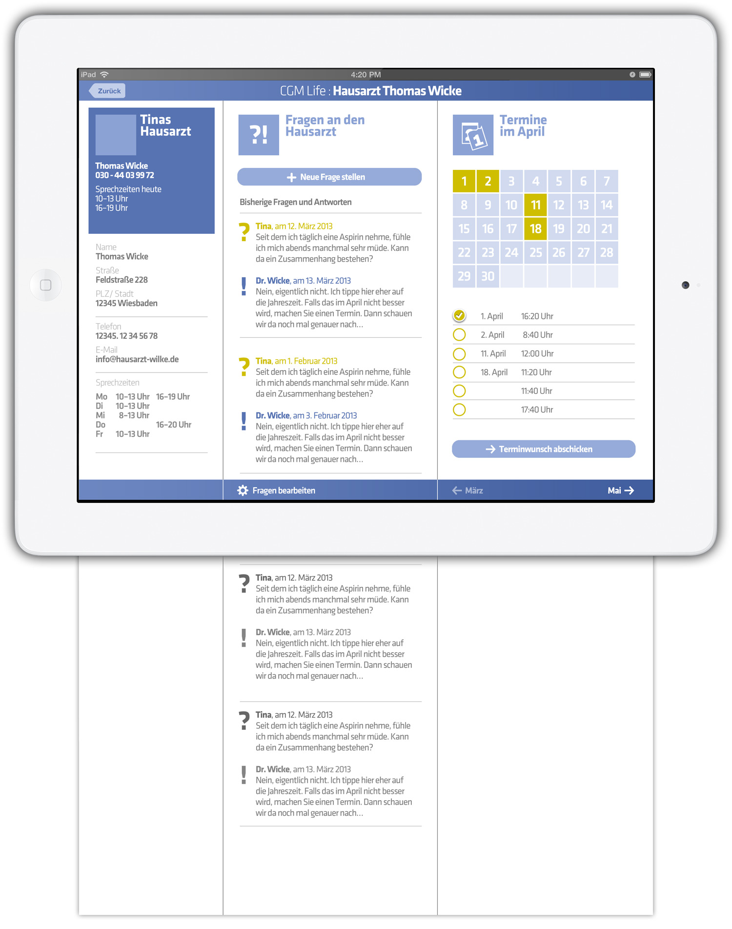 Kreativdirektion, User-Experience-Design, User-Interface-Design, Mobile-App-Design und Corporate-Design für CompuGroup Medical AG · Die von uns entwickelte Fallstudie für Design und Nutzerführung einer zentrale Patienten-App der CompuGroup Medical führte uns zu einem Auftrag von CGM, in dessen Rahmen wir dann das Design eines großen Webportals entwickelt haben, das Patienten Zugang zu persönlichen digitalen Gesundheitsdaten und ihrer sicheren Verwaltung geben soll.