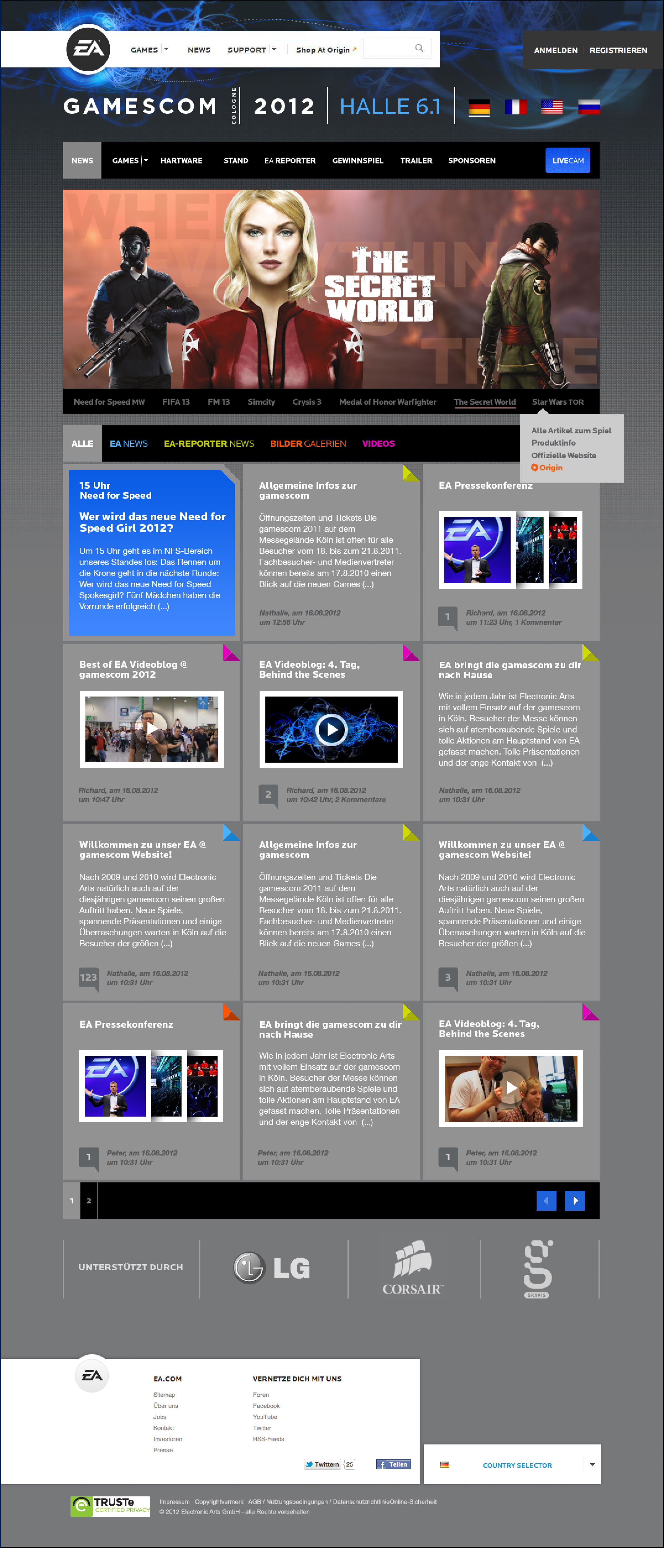 Kreativdirektion, Webdesign und Frontend-Progammierung für Electronic Arts · Webdesign und standardkonformes Frontend-Coding des viersprachigen Messewebauftritts von EA auf dem weltweit größten Messe- und Event-Highlight für interaktive Spiele und Unterhaltung – der gamescom 2012 in Köln