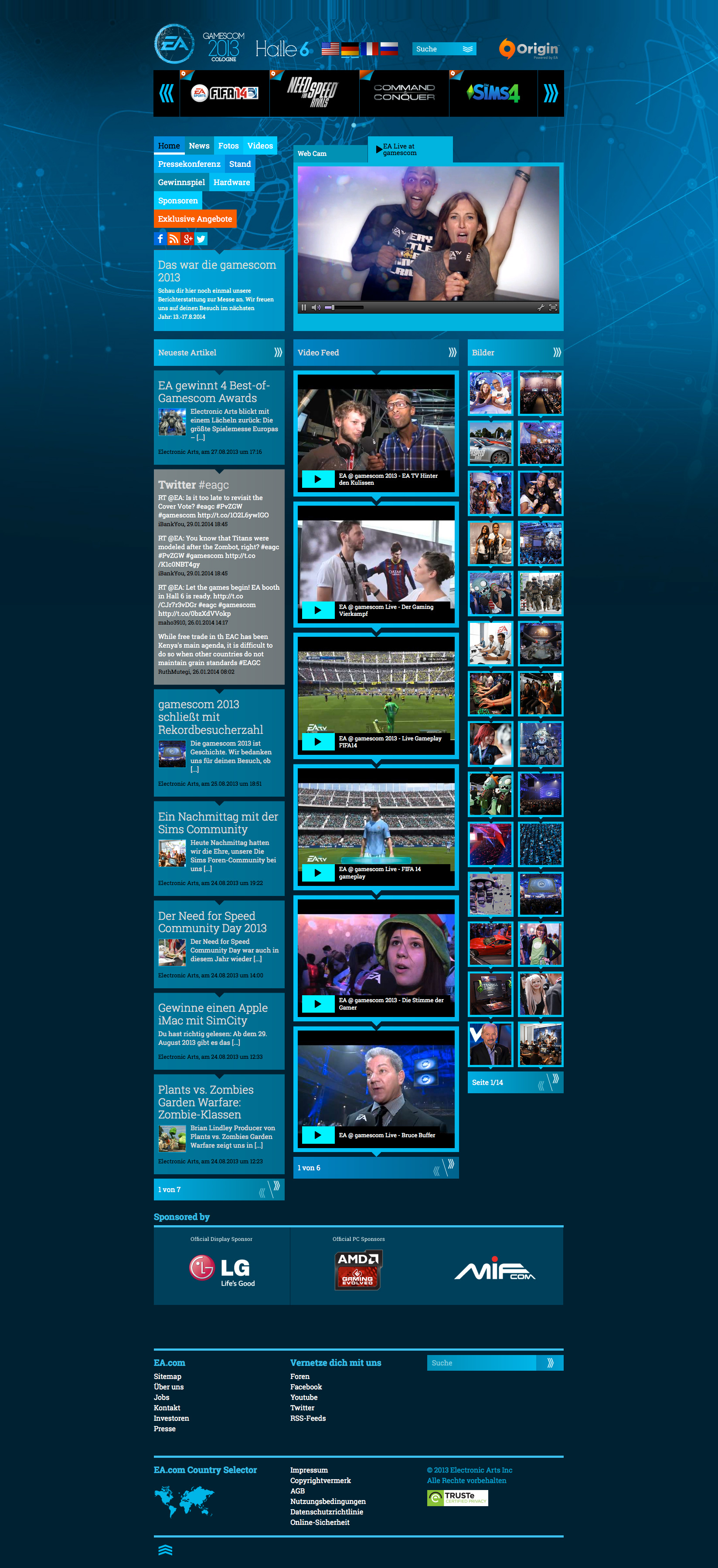 Kreativdirektion, Webdesign und Frontend-Progammierung für Electronic Arts · Webdesign und standardkonformes Frontend-Coding Messewebauftritts von EA auf dem weltweit größten Messe- und Event-Highlight für interaktive Spiele und Unterhaltung – der gamescom 2013 in Köln