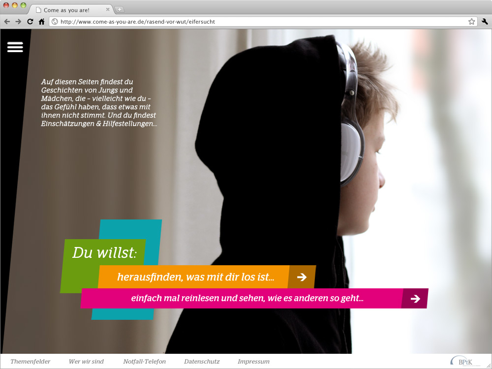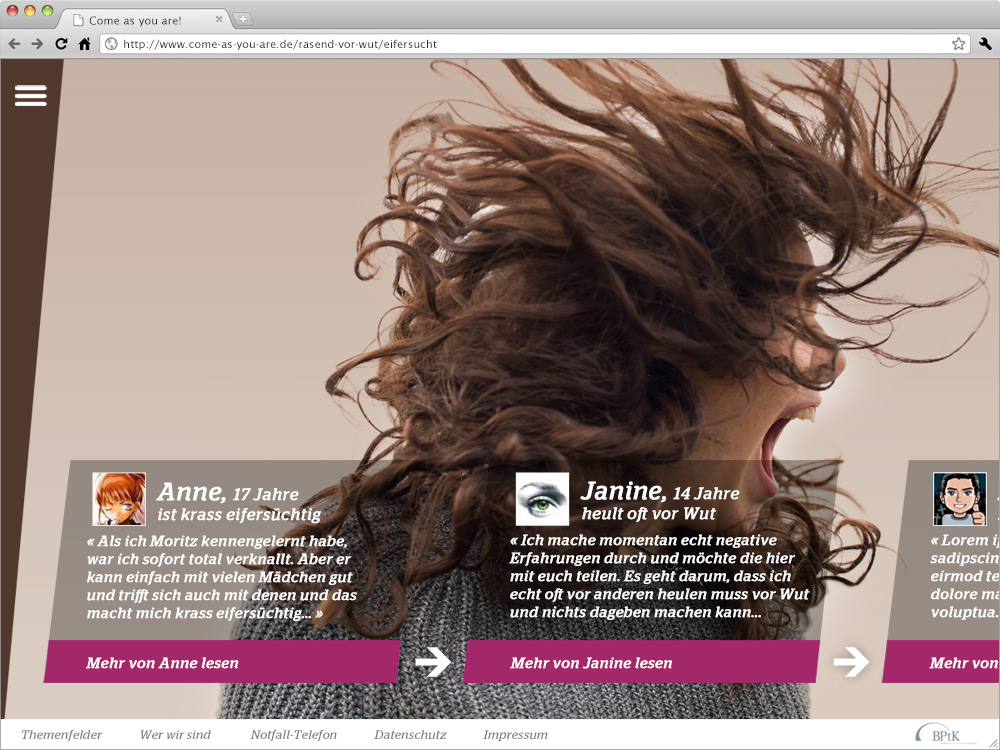 Die Website setzt auf starke Fotografie, in der sich Jugendliche wiederfinden können. Anders als ursprünglich gelpant, haben wir von der Idee, mit Illustrationen zu arbeiten, um bildrechtlichen Problemen aus dem Weg zu gehen, Abstand genommen. Mit Susanne Tessa Müller haben wir eine Fotografin gefunden, die einen magischen Draht zu Jugendlichen hat und sie so fotografieren konnte, dass starke Bilder entstehen, aber keine konkrete Person identifiziert werden kann.