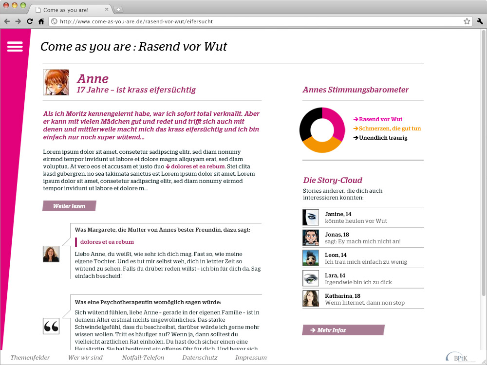 Für jedes Thema, das die BPtK vorgegeben hat, wurde eine jugendliche Persona kreiert, die ihre individuelle Geschichte wie in einem sozialen Netzwerk erzählt. Die Informationen der Therapeuten kommen über fiktive Kommentare zur Geschichte.