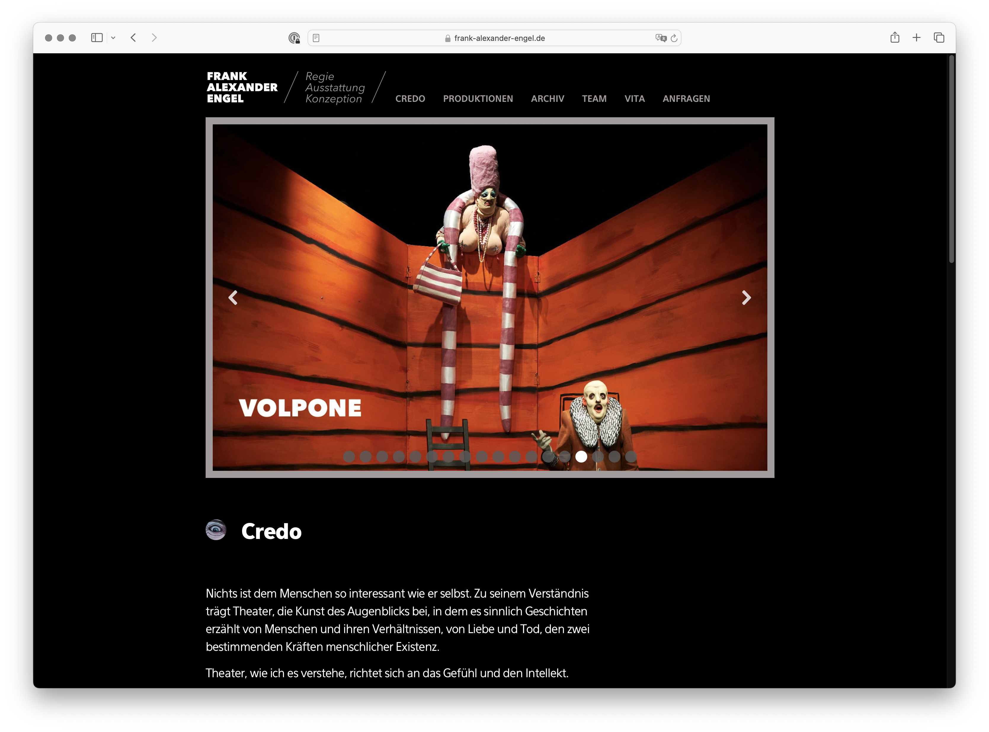 Kreativdirektion für Frank Alexander Engel · Die neue Website des Figurenthater-Machers Frank Alexander Engel, der neben Regie auch Ausstattung, Kostüme, Konzeptionen und Bühnenbilder realsiert. Frank inszeniert seine Stücke an vielen renomierten Theaterhäusern wie dem Jungen Theater Osnabrück, dem Theater Chemnitz, dem Theater Waidspeicher, den Landesbühnen Sachsen, dem Anhaltischen Theater Dessau, dem Theater Junge Generation Dresden, u.a.